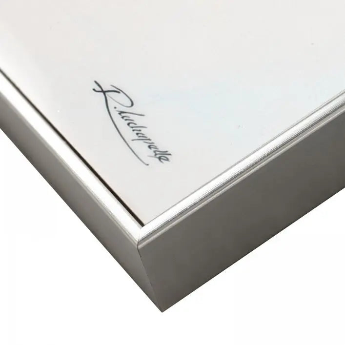 A slimline silver frame wraps itself around the high gloss acrylic artwork.