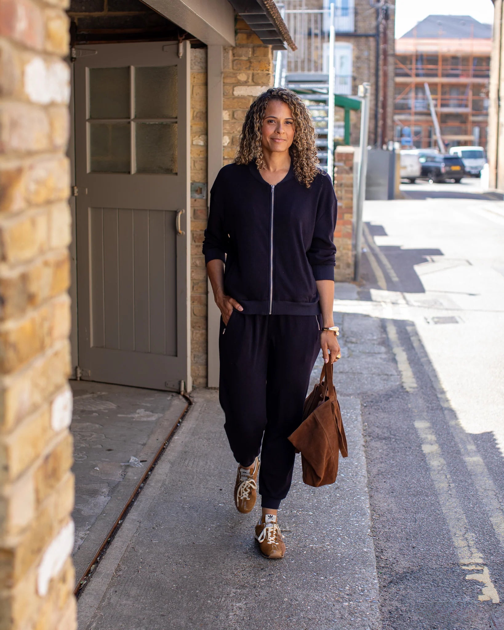 Ella Pant is a super soft jersey knit pant, featuring side zip pockets, an elasticated and drawstring waist, and ribbed cuff ankles, these pants offer both practicality and effortless look. Perfect for lounging and pairing with matching jumpers.